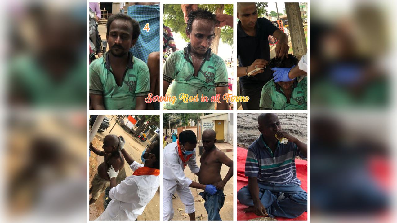 They were given a neat bath using Dettol water, soaps and scrubs. Their hair and beard were trimmed, and new dresses were given to give them a neat look. Divya prasadam along with a juice packet was served to them. This apart, they were provided with necessary skin ointments etc. to ensure their existing wounds are healed soon.