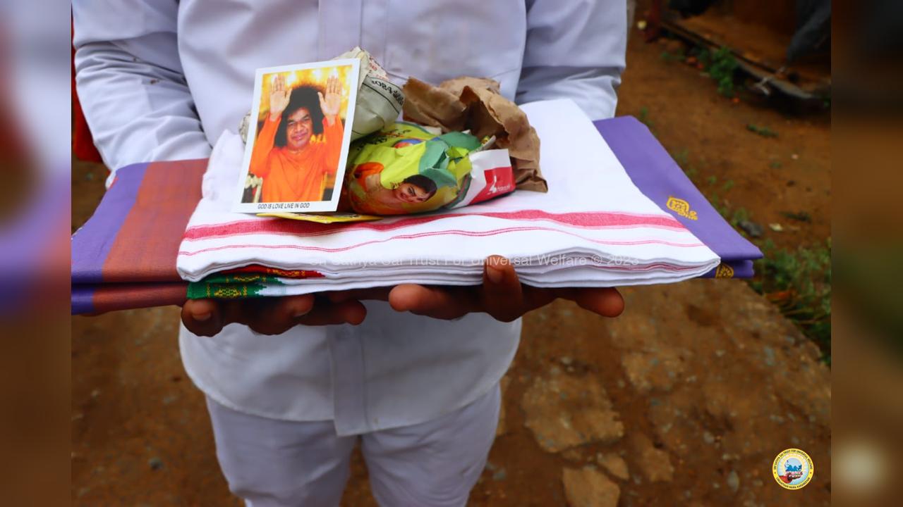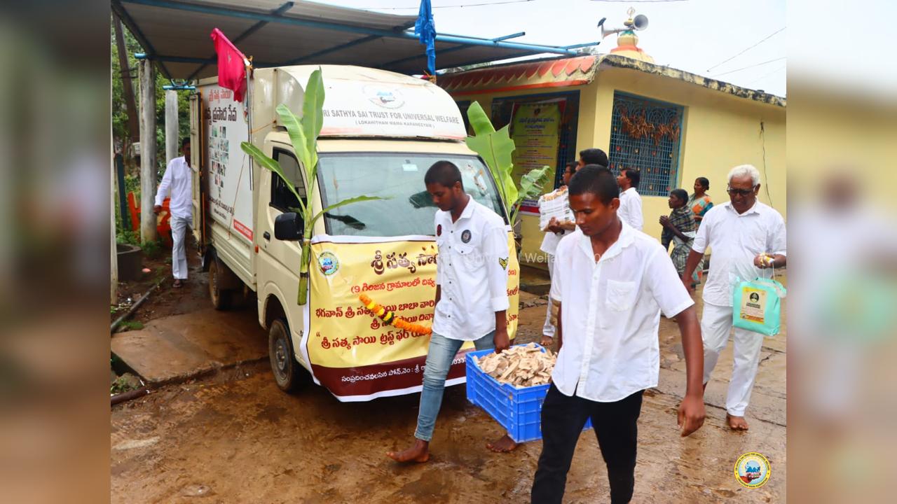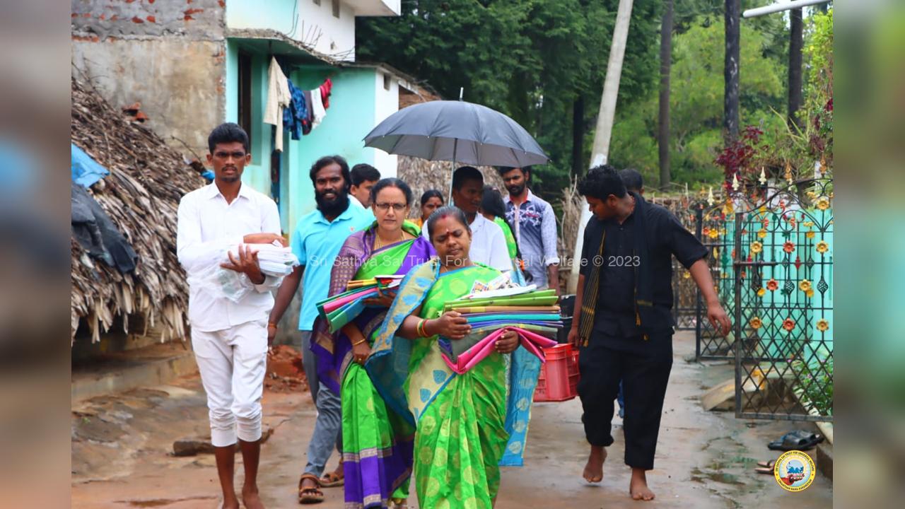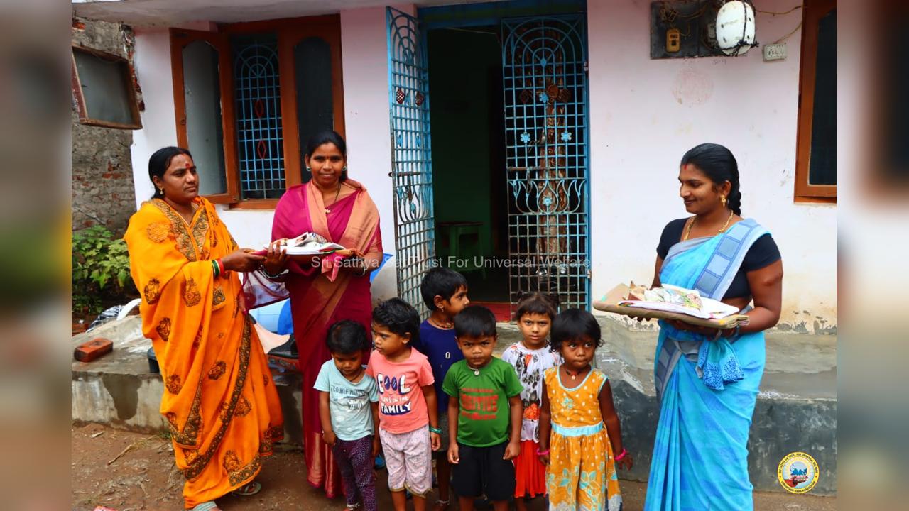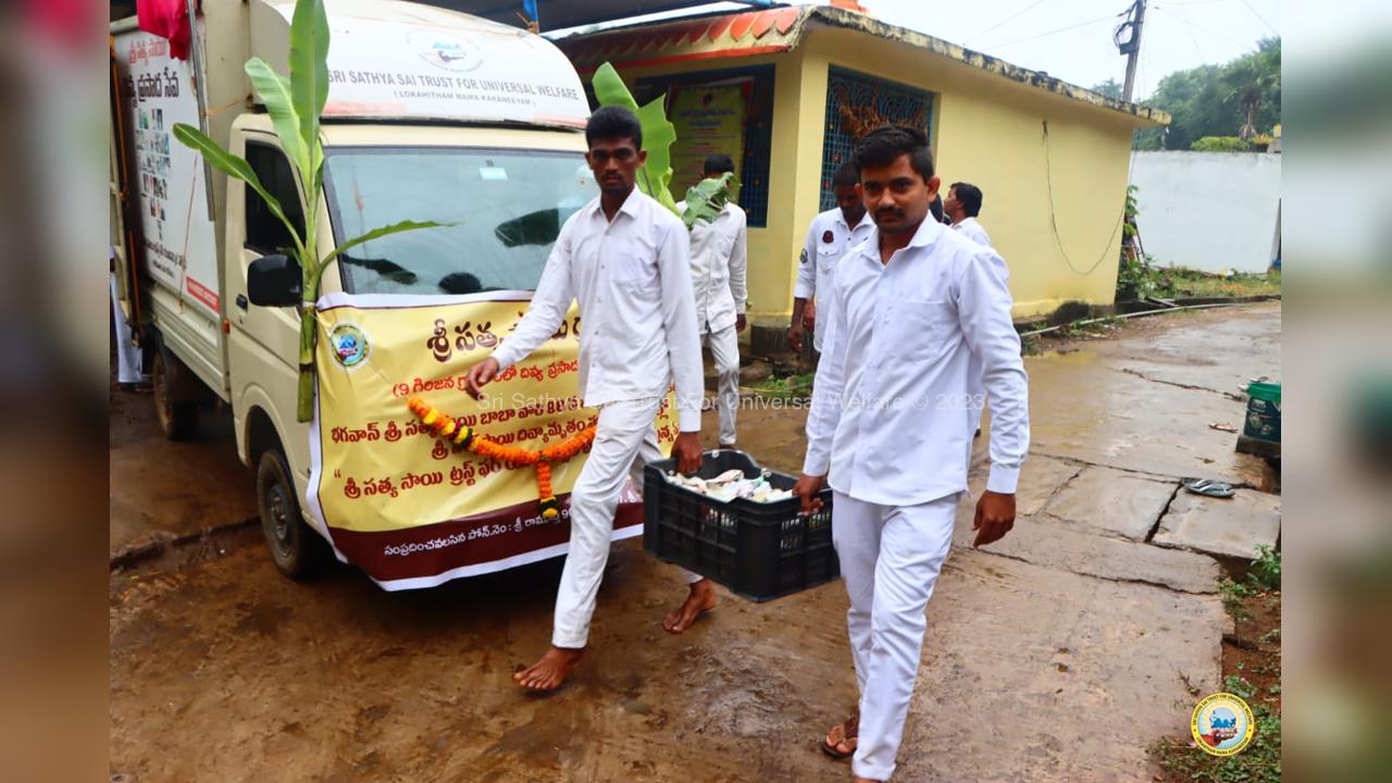 The army of loving devotees of Swami with their Lord went to the villages and performed Grama Seva where hundreds of needy families were provided with food, sarees, dhotis and divya prasadam including pulihora and laddoo. The recipients were thrilled to receive Swami's Prasadam on the occasion of Swami's Birthday!